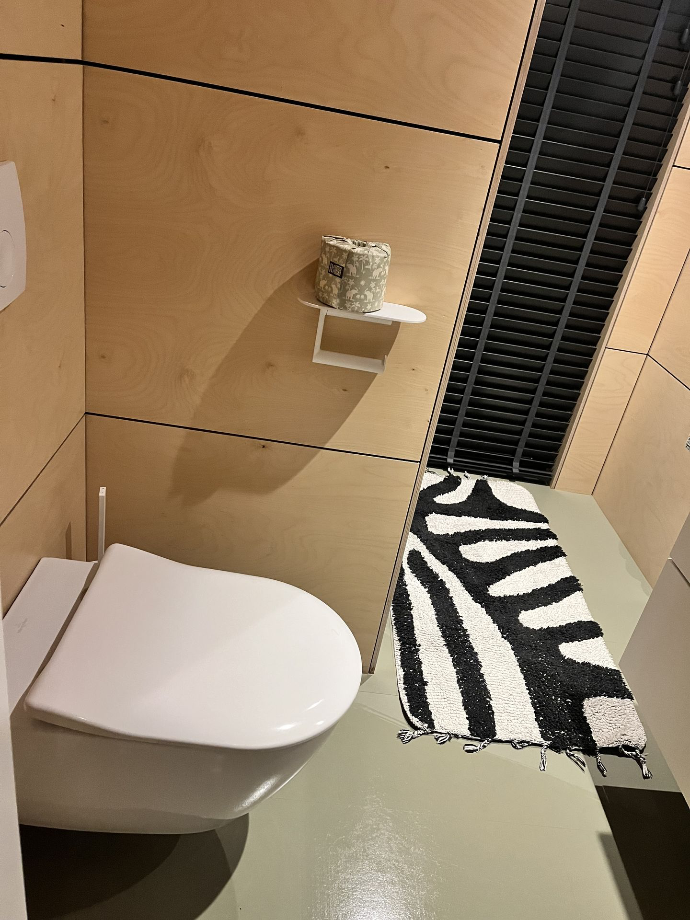 Met een ruime douche, een hangend toilet, een klein wastafeltje en een grote spiegel.